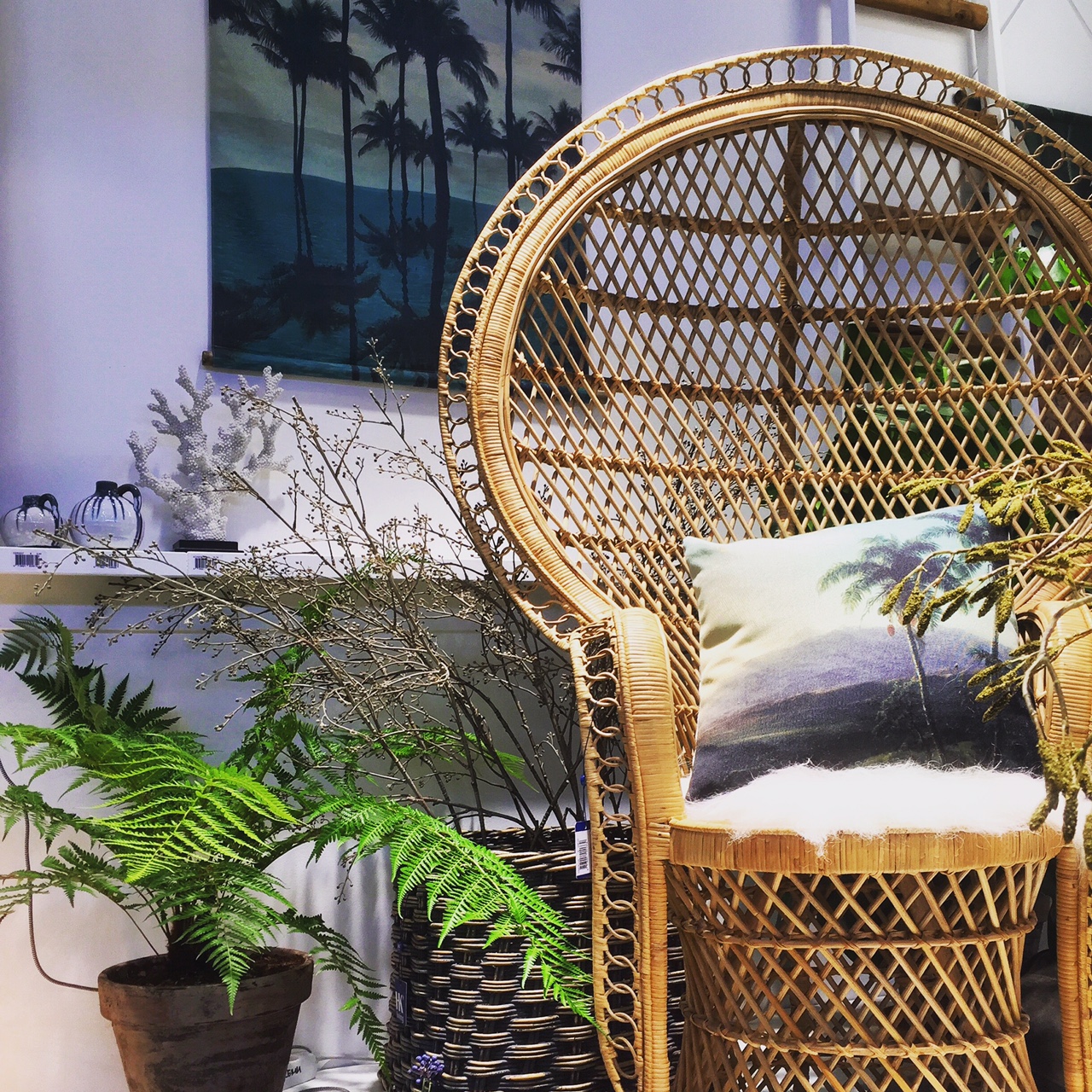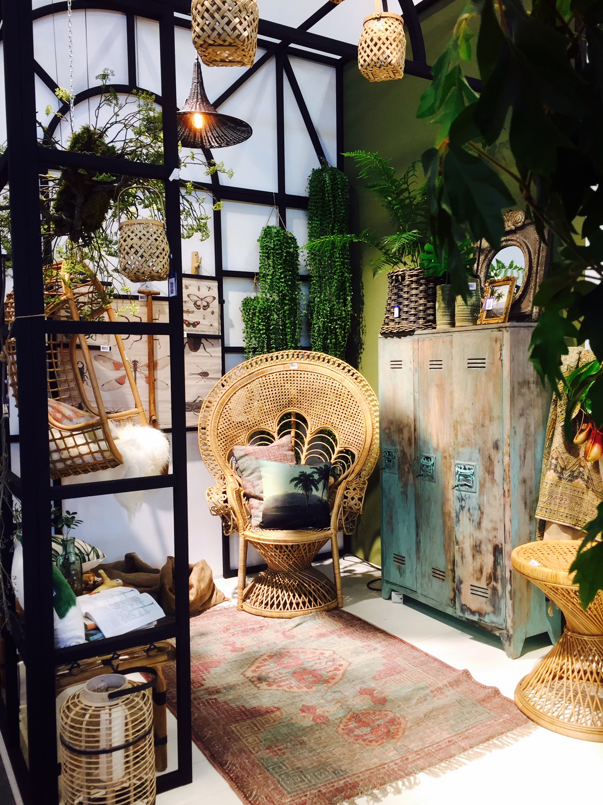 De botanische trend is er nog steeds, maar uitgebreid met nieuwe kleuren en materialen. Veel grote kamerplanten en hangplanten in combinatie met natuurlijke materialen, zoals een rotan stoel of lampenkap en met robuust houten producten zoals schalen, plantenbakken en fotolijstjes. Verder zag je volop dieren- en plantenprints op posters, kaarten en kussens. En op de vloer rieten matten of stoere gewassen linnen kleden in mooie vergrijsde in elkaar overgelopen kleuren. Voor een mooie natuurlijke basis in je huis!